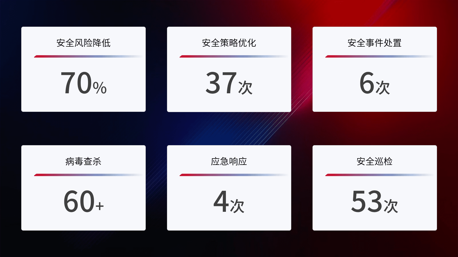提供全面的安全事件报告体系,,,包括处置报告、、、周报、、、、季度和年度总结,,,结合持续监控,,,,帮助客户深入了解网络安全状况。。。