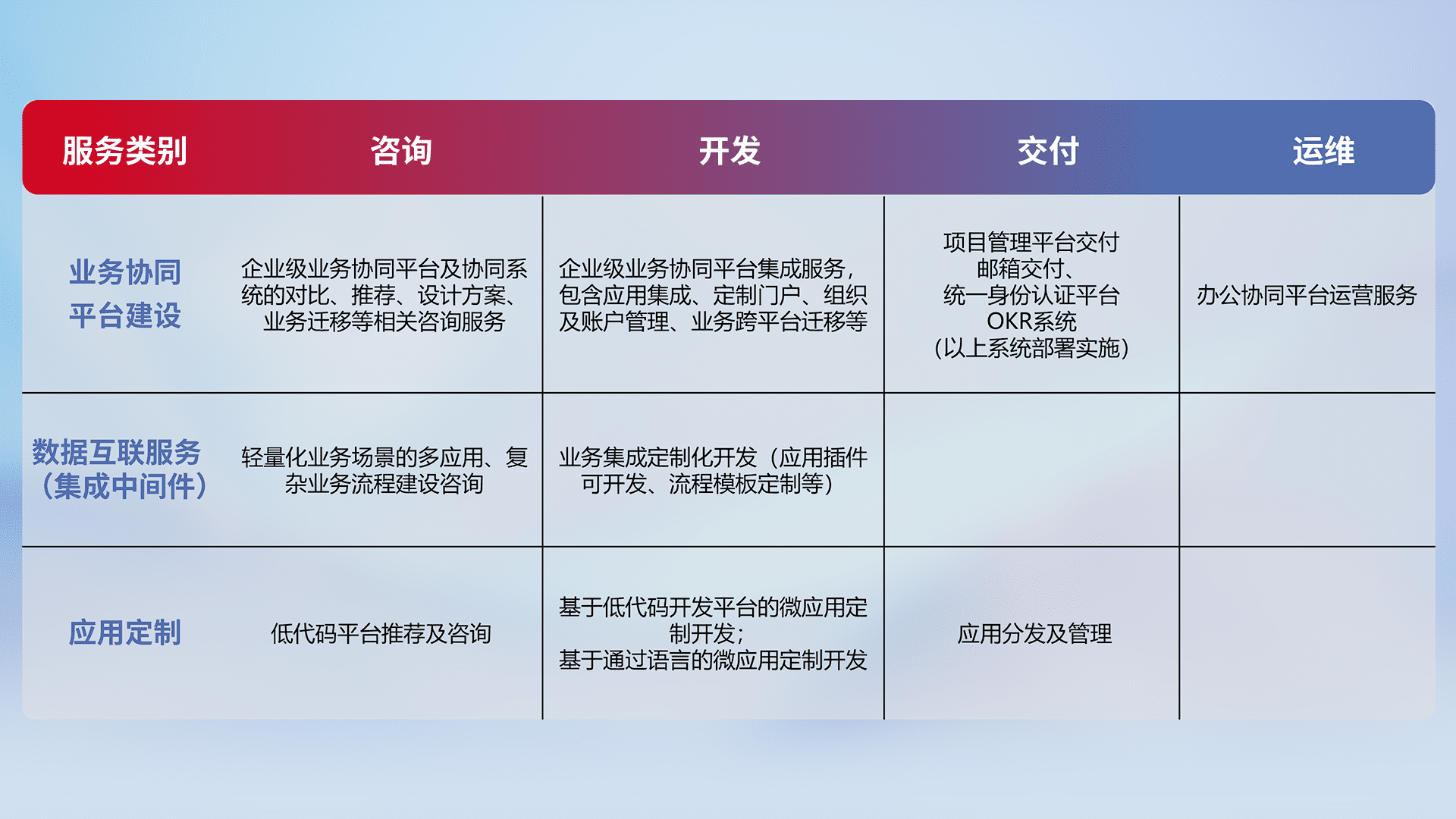 针对钉钉、、、、企微、、IDaas等平台级产品提供产品的规划、、、、方案、、交付、、、定制化开发等服务,,,实现如统一协同办公、、、智能客户服务、、混合会议管理、、智能数据查询、、、等业务场景,,,实现数字化转型。。。。