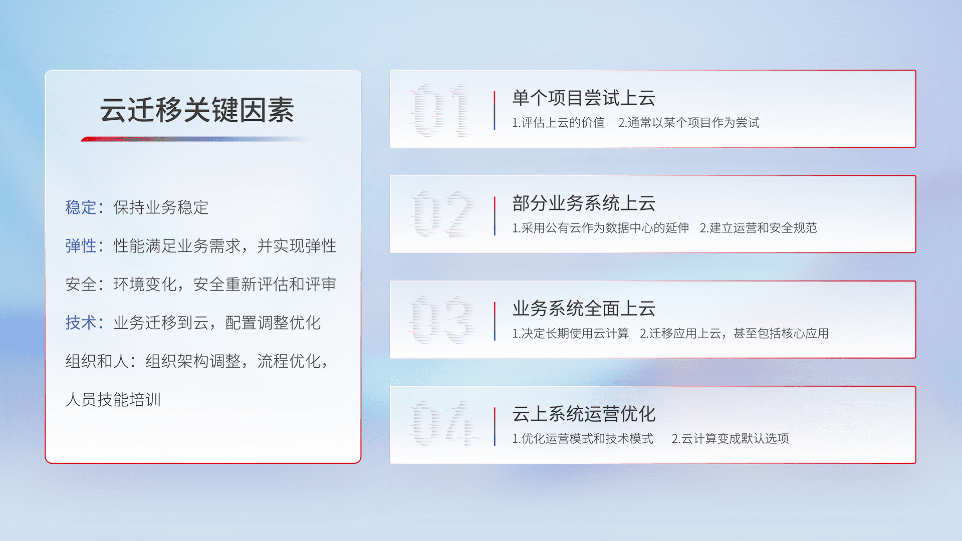 结合实际业务,,,,从规划设计、、、云平台选型、、、云原生改造、、、、数据迁移、、、、集成交付,,迁移全过程为客户识别最佳上云路径,,,,做好风险识别管理,,,,设计网络架构、、、身份权限、、安全审计合规、、、操作审计、、、日志审计、、监控告警策略、、、多站点容灾设计等,,,,对云上基础设施进行整体规划,,,提升IT治理水平,,,以满足弹性、、高可用、、、、高性能的需求。。